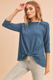 This t-shirt features a twist front detail, adding a trendy and flattering touch to the design. With a round neckline, it offers a classic and easy-to-wear look for various occasions. The 3/4 sleeves provide a balance between coverage and breathability, perfect for transitional seasons. Pair this chic and modern t-shirt with your favorite bottoms for a fashionable and effortless outfit.