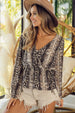 The Snake Skin Woven Crossover Long Sleeve Top features a stylish snake print design and a crossover detail on the front. This trendy top combines bold snake skin pattern with a unique crossover style for a fashionable look. The long sleeves add a touch of warmth, making it a versatile piece that can be dressed up or down for different occasions.