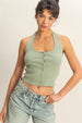 The Halter Neck Buttoned Washed Top is a stylish and chic piece that is perfect for warm weather. The halter neck design adds a touch of sophistication and elegance to the top. The buttoned detailing provides a vintage and classic vibe. This washed top has a relaxed and casual look, making it ideal for everyday wear. Pair it with high-waisted jeans or shorts for a fashionable and effortless outfit that's perfect for a casual day out or a beach vacation.