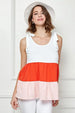 Stay on-trend with this color block sleeveless tie shoulder babydoll top. The color block design adds a modern and eye-catching element to the top. The tie shoulder detailing offers a playful and adjustable touch. The babydoll silhouette is flattering and comfortable for all-day wear. Pair with shorts or jeans for a cute and stylish outfit. Embrace a chic and fun style with this versatile and trendy top.