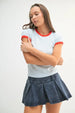 The Contrast Trim Fitted Baby Tee is a stylish and flattering option for a casual yet trendy look. Its contrast trim detailing adds a chic touch to the classic baby tee style. The fitted silhouette enhances your figure while providing a comfortable fit. Perfect for pairing with high-waisted jeans or a skirt, this tee is versatile and easy to style. Whether you're running errands or meeting friends for coffee, the Contrast Trim Fitted Baby Tee is a versatile piece that can be dressed up or down with ease. Stay effortlessly cool and on-trend with this must-have wardrobe staple.